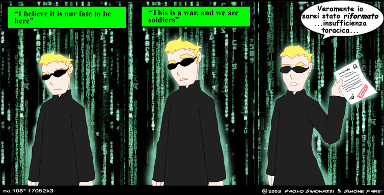 Gli occhialini di Neo (del nostro Neo) sono apparsi nella prima strip di Follow the Rabbit e sostanzialemente, al di là della battuta, sono il vero motivo per cui quella strip mi piace tanto. L'idea, naturalmente, è stata dell'artista grafico e da allora, tutte le volte che l'argomento del nostro vignettare si avvicina almeno un pochino a Matrix, gli impongo assolutamente questo accessorio tanto cool.