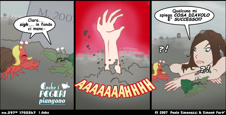 Il cinema italiano è finito con Bava e Leone, e in questa strip compare quello che Quentin Tarantino chiamerebbe “un effettaccio all'italiana”. Come ci sia finito in una serie che vorrebbe parodiare le telenovelas latine è un mistero... ma in fondo siamo ormai alla fine di Anche I Paguri Piangono, e gli Autori si concedono qualche bizzarria. Come Clara sia passata dal tribunale direttamente alla tomba, annullando come minimo i tempi giudiziari, è forse un mistero ancora maggiore, ma si sa che le soap-opera non cercano il realismo a tutti i costi. Specie quando gli attori sono paguri.