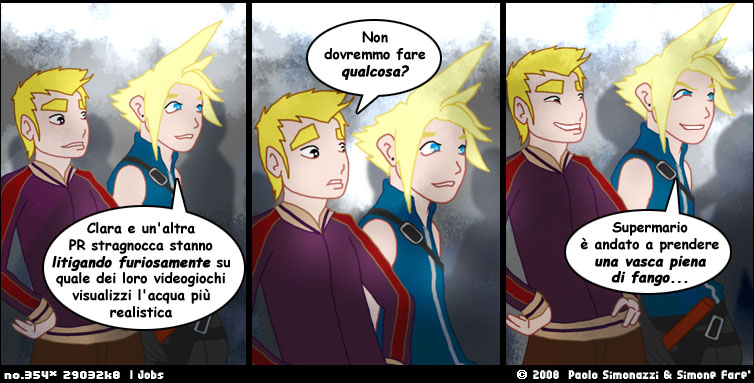 Lo so, nella strip odierna potevo usare per l'ennesima volta il nome di Jade Raymond, ma non ho voluto. Non ho voluto perché ho come l'impressione che quella delle PR gnocche sia una tendenza che prenderà sempre più piede negli anni a venire. In fondo noi videogiocatori, quando andiamo alle fiere, sono già anni che diamo più retta alle booth babes piuttosto che ai promotori delle varie software house, affidare il potere di ammaliare le folle a ragazze molto piacevoli è il buon compromesso tra ciò che gli oscuri signori vogliono e ciò che noi, piccoli nerd affamati, cerchiamo. In qualche modo, oltretutto e paradossalmente, questo uso farà anche credere a coloro che vengono da fuori che non siamo più il popolo di misogini maschilisti ammalati di sesso di cui per anni abbiamo avuto la nomea. Si, coloro che vengono da fuori lo crederanno. Gli stolti.
